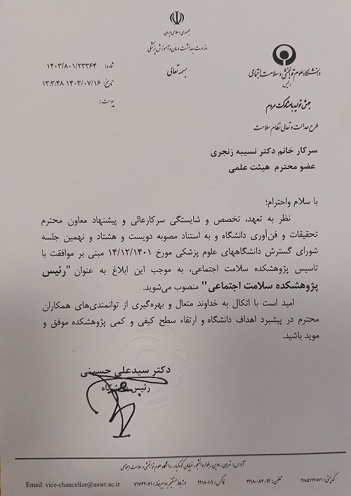 انتصاب ریاست پژوهشکده سلامت اجتماعی دانشگاه