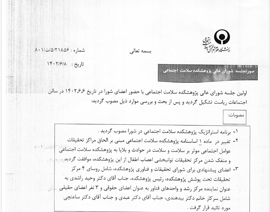 اولین جلسه شورای عالی پژوهشکده سلامت اجتماعی با حضور اعضای شورا در تاریخ 1402.6.6 در سالن اجتماعات ریاست تشکیل گردید.